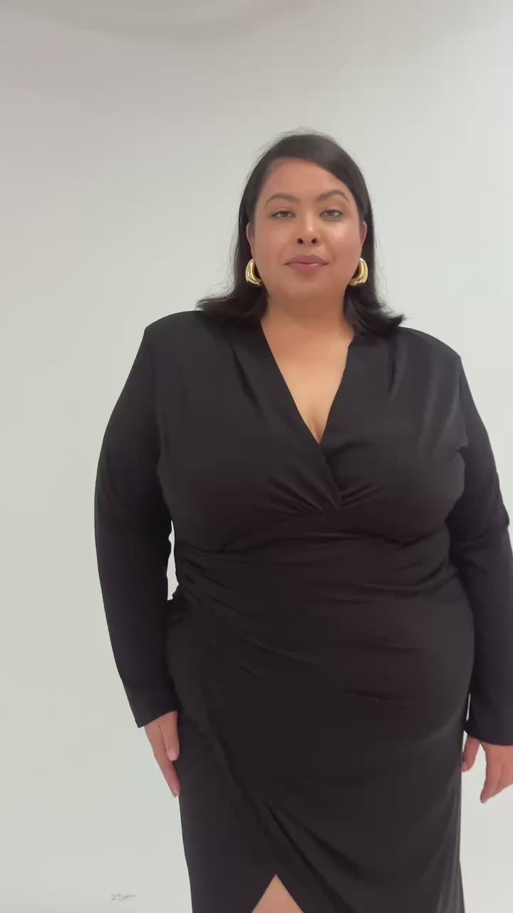 Elevate your evening look with this elegant black V-neck maxi plus-size dress, designed with a ruched front that beautifully enhances and flatters the figure. The deep V neckline adds a touch of allure, while the long sleeves offer a sleek, balanced silhouette perfect for cooler evenings or more formal settings. Crafted from a soft, stretch fabric, this dress gently hugs the body and falls effortlessly to the floor, creating a graceful, elongated shape. Sophisticated and timeless, this black maxi plus-size dress is ideal for everything from special occasions to black-tie events—an effortlessly chic choice with subtle, eye-catching detail.