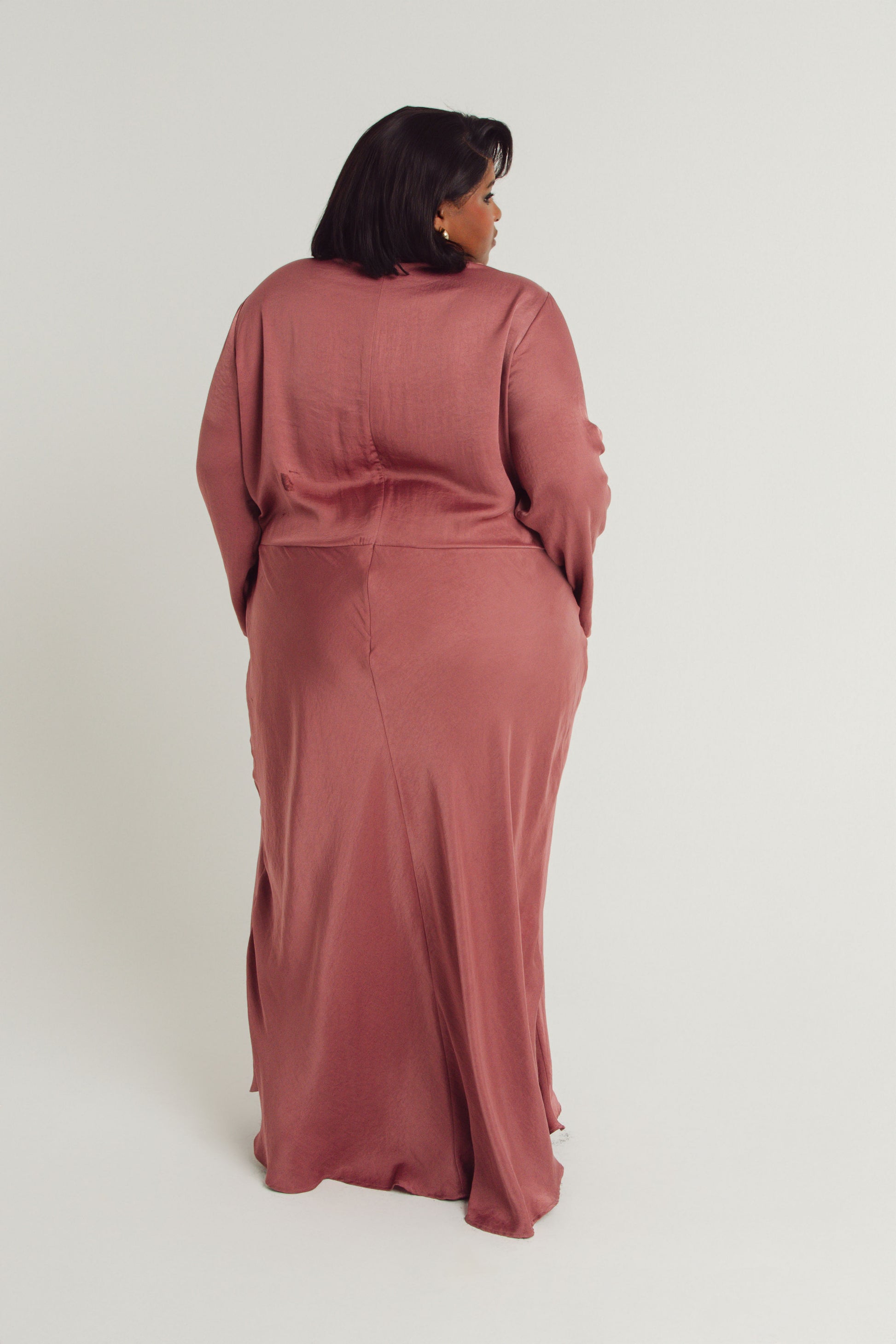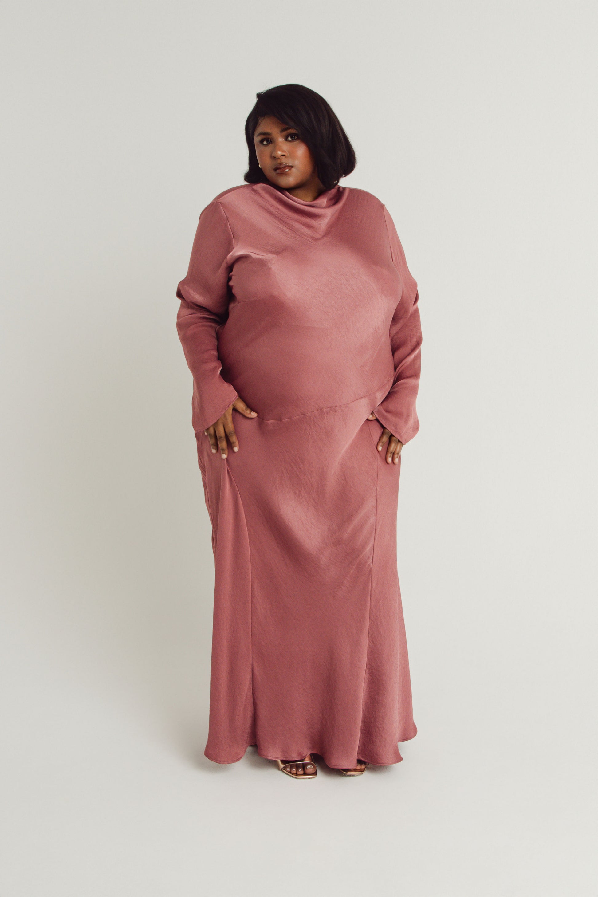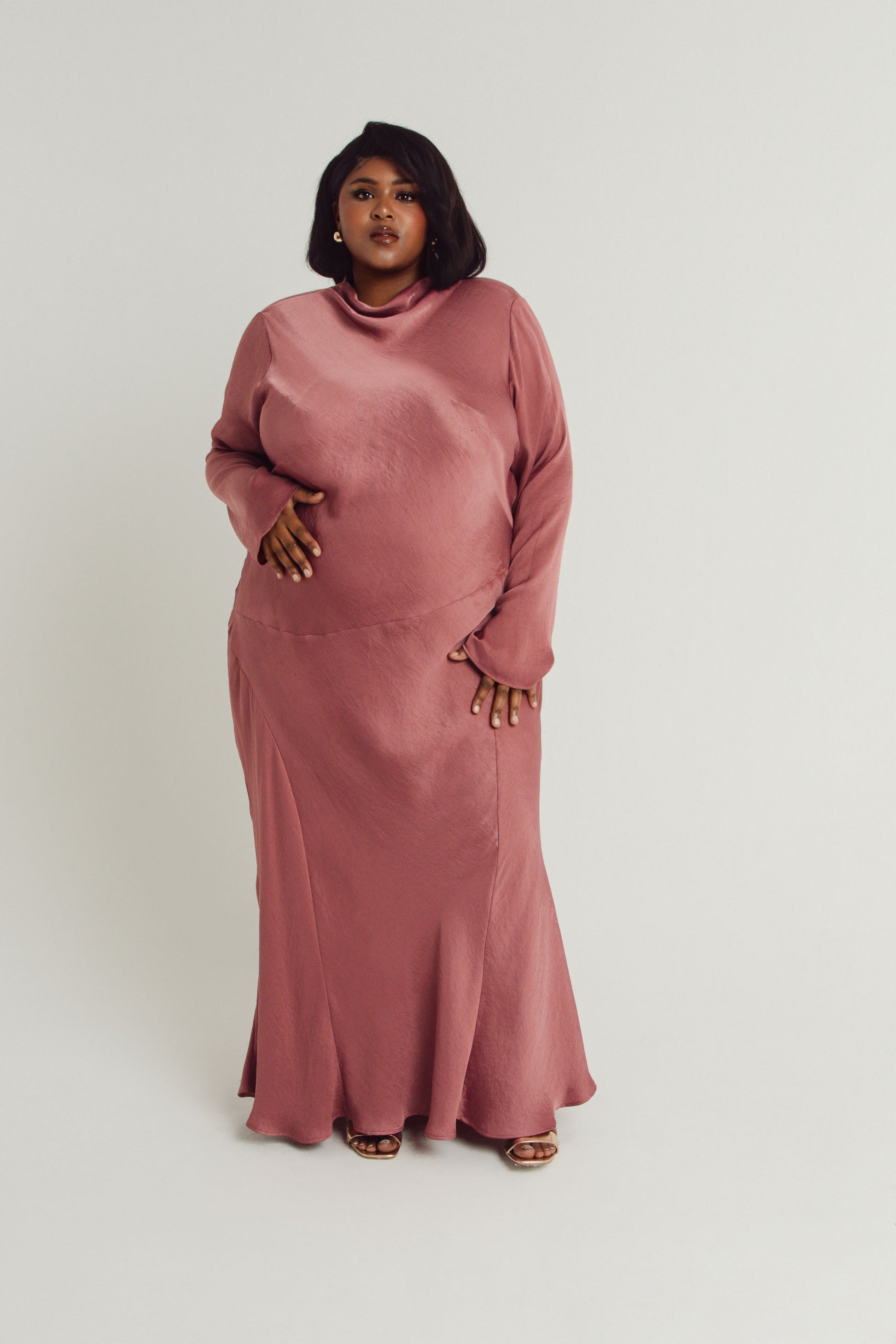 Flatter your curves in this stunning rose pink plus-size maxi dress. Designed with a bias-cut silhouette, it drapes beautifully over your shape without clinging. The soft, silky fabric flows effortlessly, while the long sleeves add elegance and comfort. Perfect for weddings, evenings, or any special occasion. This also covers up so perfect for the modest plus-size girls.