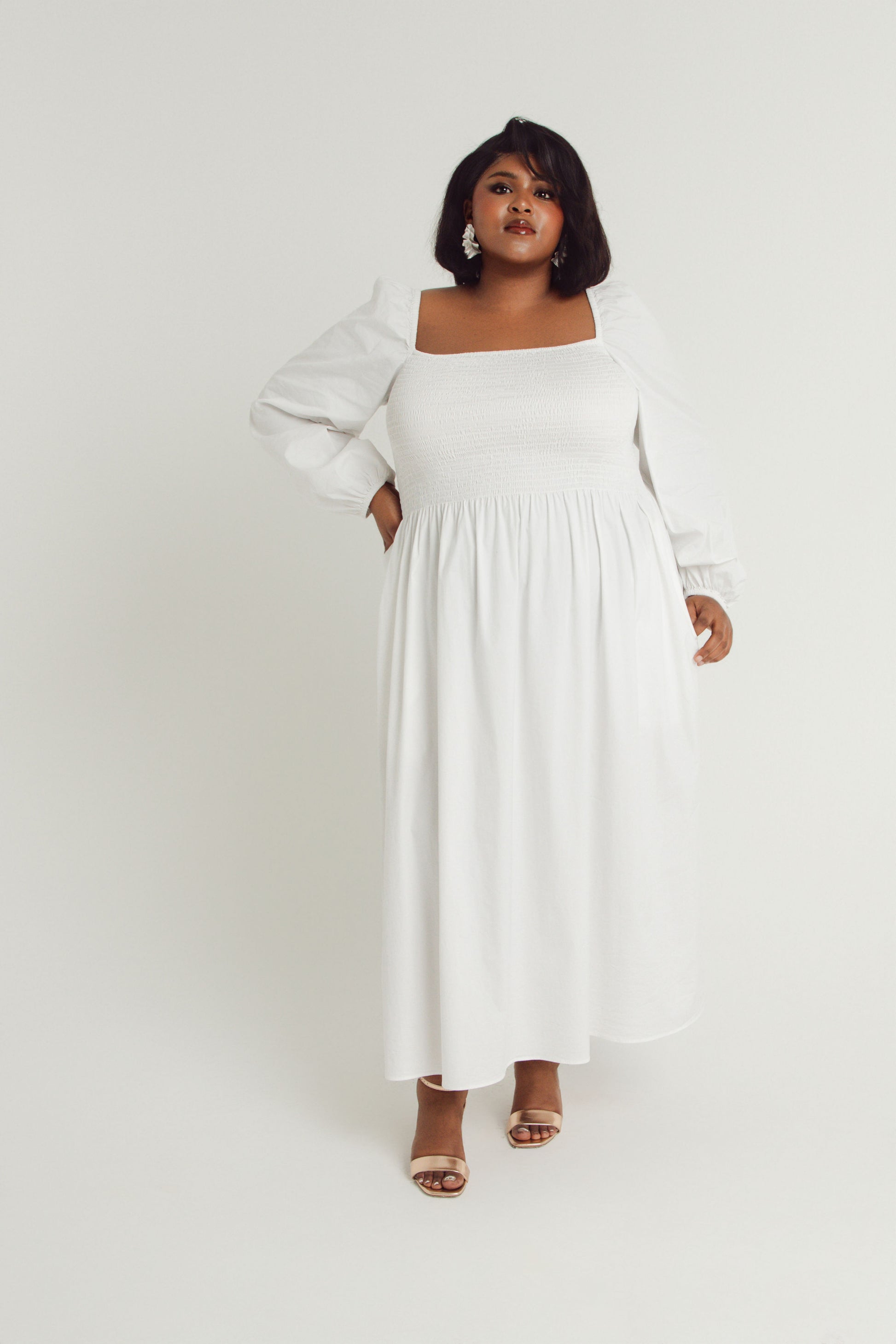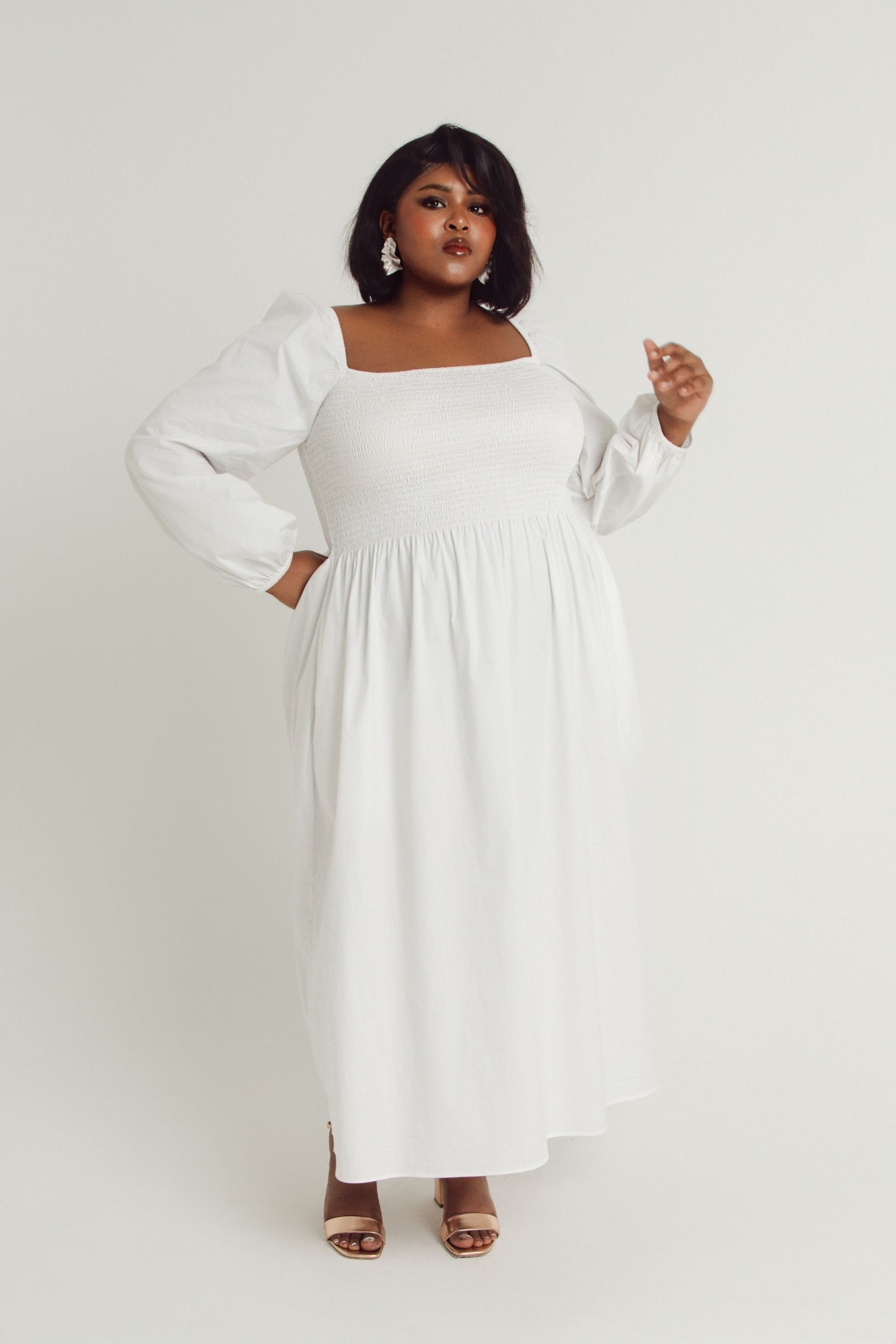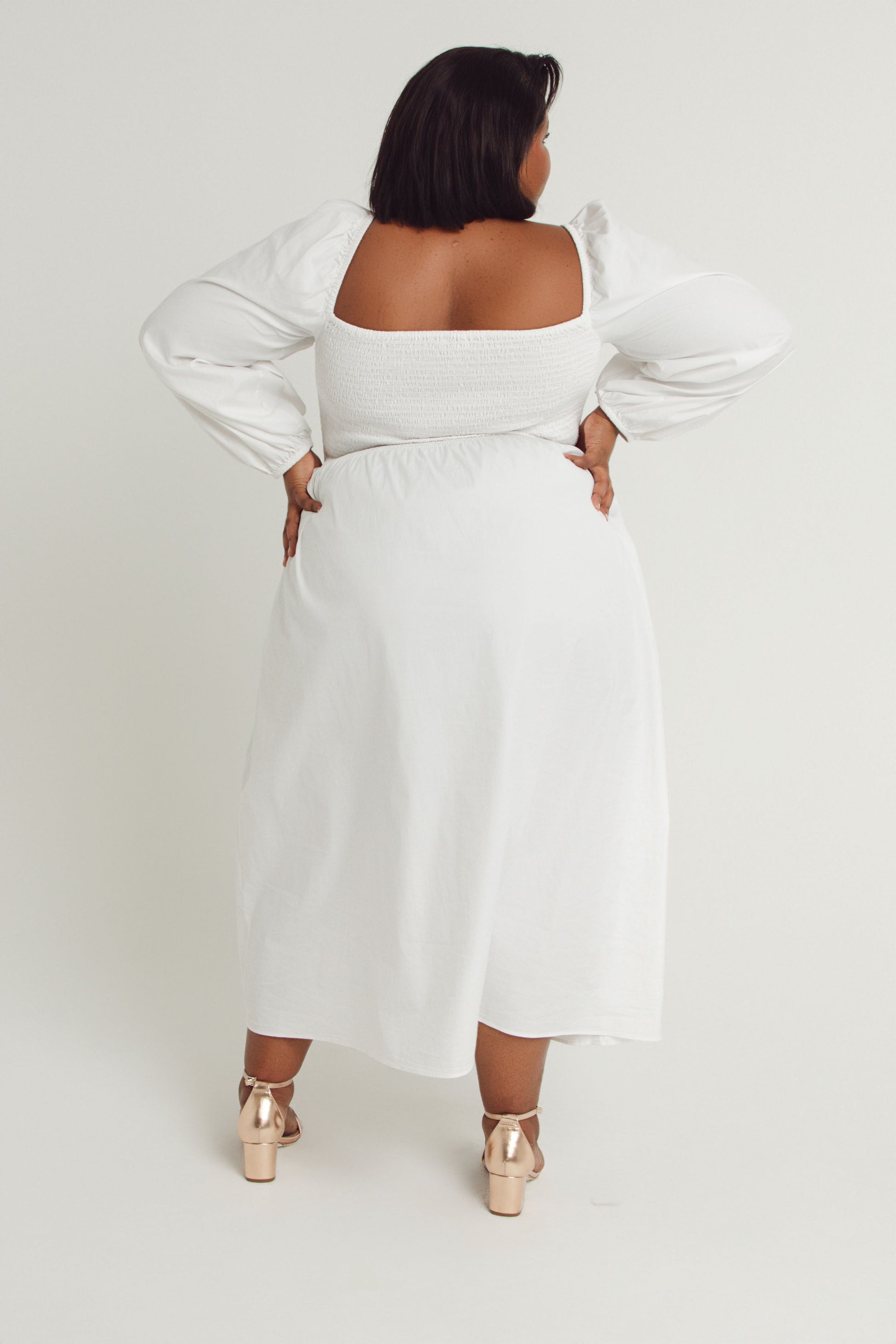 Effortlessly feminine and flattering, this white cotton midi plus-size dress features a stretch shirred bodice that hugs your curves in all the right places. With soft, breathable fabric, long sleeves, and a flowy midi skirt, it’s the perfect blend of comfort and timeless style — made to move with you, from brunch to date night.